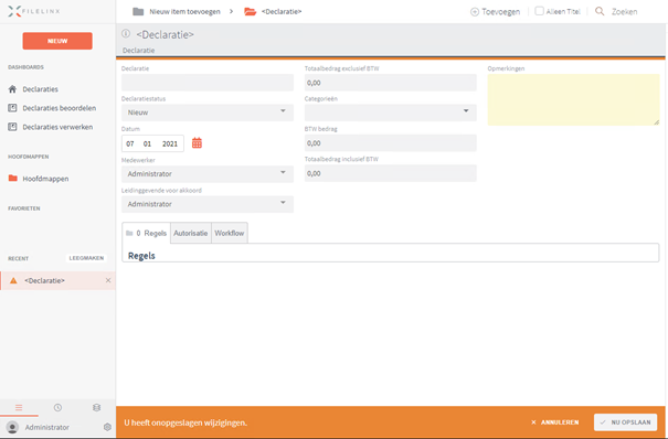 Een nieuwe declaratie kan worden aangemaakt door op de oranje knop “Nieuw” in de linker kantlijn te drukken en vervolgens te kiezen voor “Declaratie”. Op dat moment wordt er een nieuwe declaratie aangemaakt.