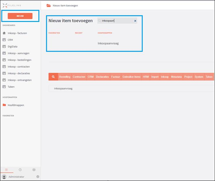 Een inkoopaanvraag kan de eerste stap zijn van het inkoopproces, maar inkopers kunnen deze stap overslaan en direct starten met een nieuwe inkoopbestelling. Gebruikers die het is toegestaan om inkoopaanvragen te doen, kunnen een nieuwe inkoopaanvraag opvoeren door in het FileLinx portaal op de knop “Nieuw” te drukken en vervolgens te kiezen voor de “Inkoopaanvraag”.